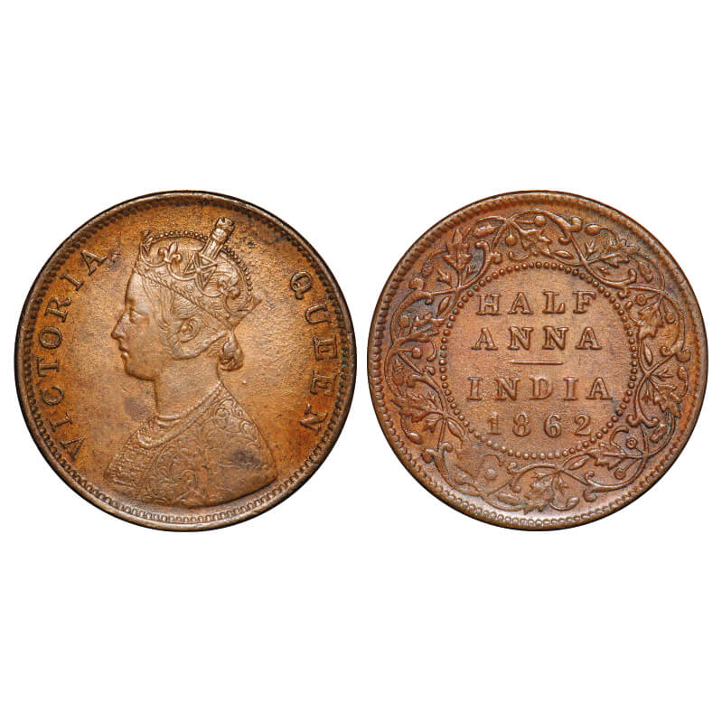 Victoria Queen, Copper, 1/2 Anna, 1862, Calcutta Mint, A/II, Pineapple like flower buds. F. Prid Un...