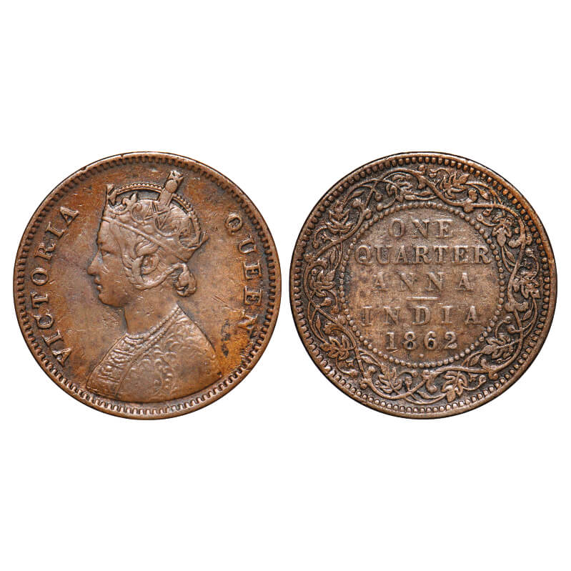 | Victoria Queen, Copper, Quarter Anna, 1862, Bombay Mint, A/I, Dot, With tiny 'V' incused, Dot below year date 1862. F. Prid 603. GK 398. Very Fine. Very scarce. |