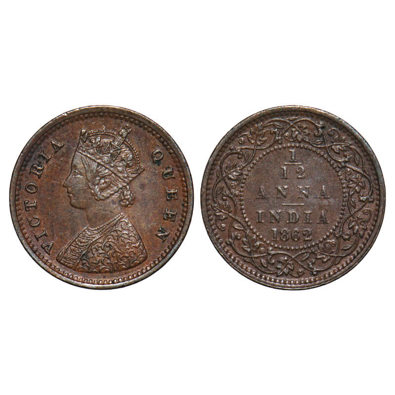 Victoria Queen, Copper, Half Pice, 1862, Calcutta Mint, A/I, The numeral 1 of year date 1862 has a ...