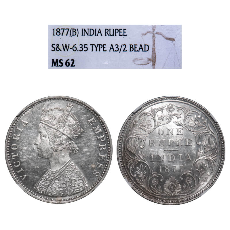Victoria Empress, Silver, Rupee, 1877, Bombay Mint, A3/II(i), Dot. F. Prid Unlisted. GK 441. NGC Slab MS 62. Very Rare.