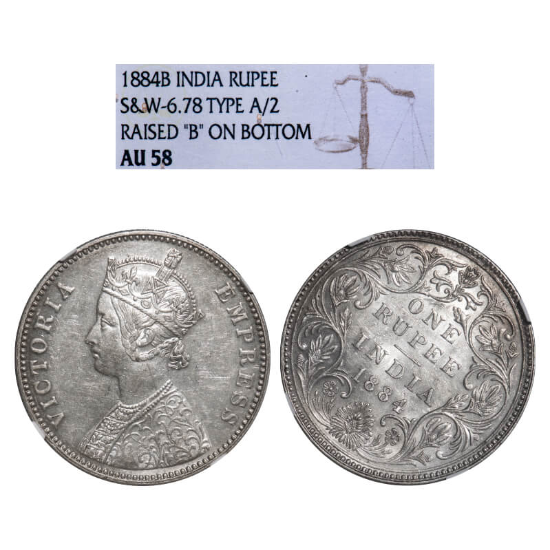 Victoria Empress, Silver, Rupee, 1884, Bombay Mint, A3/II(i), 'B' raised (bottom), Almost 1' o clock die rotation on Rev. F. Prid 166. GK 487. NGC Slab AU 58. Scarce.