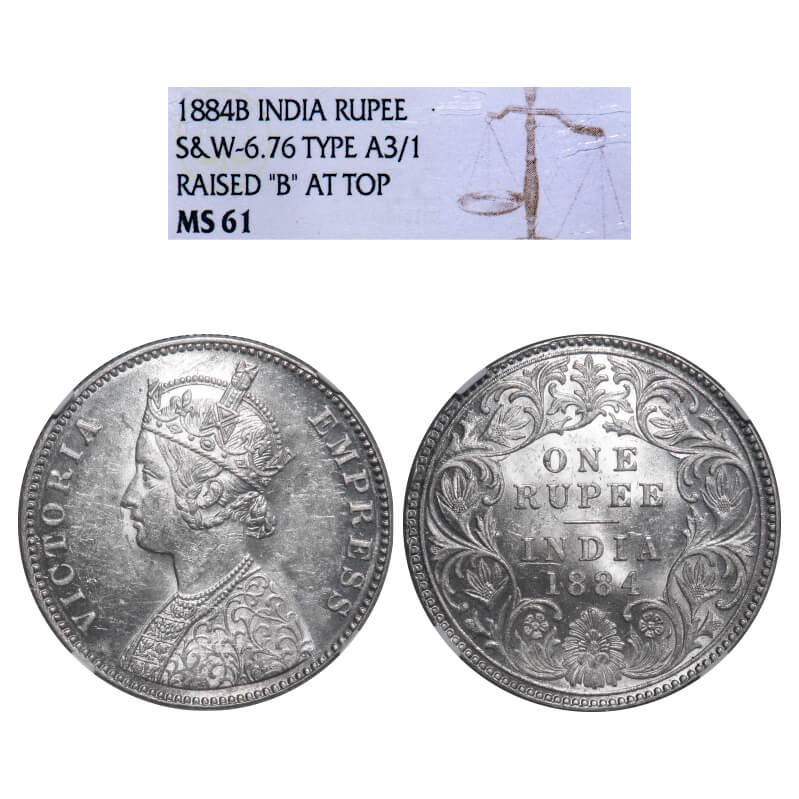 Victoria Empress, Silver, Rupee, 1884, Bombay Mint, A3/I, 'B' raised. F. Prid 167. GK 489. NGC Slab MS 61. Rare.