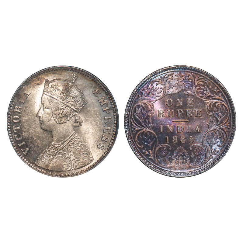 | Victoria Empress, Silver, Rupee, 1885, Calcutta Mint, A1/I, 'C' incused, Top stroke of numeral 5 short. F. Prid 124. GK 518. Uncirculated, Toned Rev. Rare. |