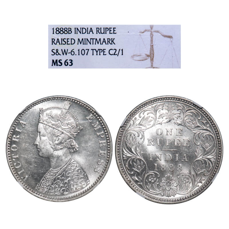 Victoria Empress, Silver, Rupee, 1888, Bombay Mint, C2/I, 'B' raised. F. Prid 174. GK 551. NGC Slab MS 63. Extremely Rare.