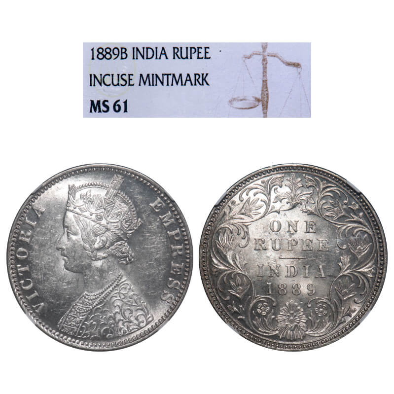 Victoria Empress, Silver, Rupee, 1889, Bombay Mint, C2/I, 'B' incused. F. Prid 177. GK 564. NGC Slab MS 61. Rare.