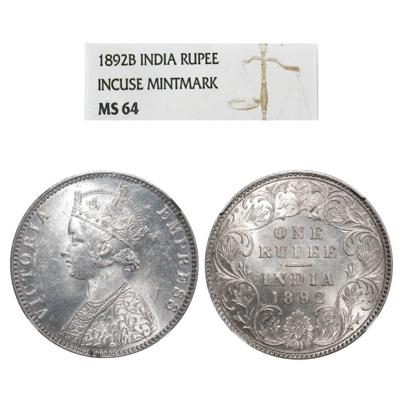 Victoria Empress, Silver, Rupee, 1892, Bombay Mint, C2/I, 'B' incused. F. Prid 181. GK 572. NGC Slab MS 64. Very Rare. (In NGC & PCGS highest graded coin, Till date). Note: MS 64 Rupee 1892 Bombay Mint was sold on July 2023 in Heritage Auction for 1400 $ and on December 2022 at 850 $)