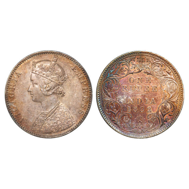 Victoria Empress, Silver, Rupee, 1892, Bombay Mint, C2/I(ii), 'B' incused. F. Prid Unlisted. GK 573. Uncirculated, Rainbow Toned. Very Scarce.