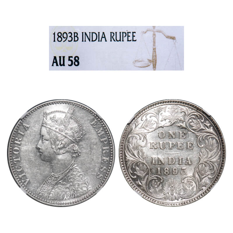 Victoria Empress, Silver, Rupee, 1893, Bombay Mint, C2/I(ii), 'B' incused. F. Prid 182. GK 578. NGC Slab AU 58. Very Scarce.