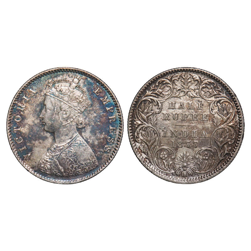 Victoria Empress, Silver, Half Rupee, 1877, Calcutta Mint, A/I, No mint mark, Die crack on Obv. F. Prid 261. GK 611. About Extremely Fine. Very Scarce.