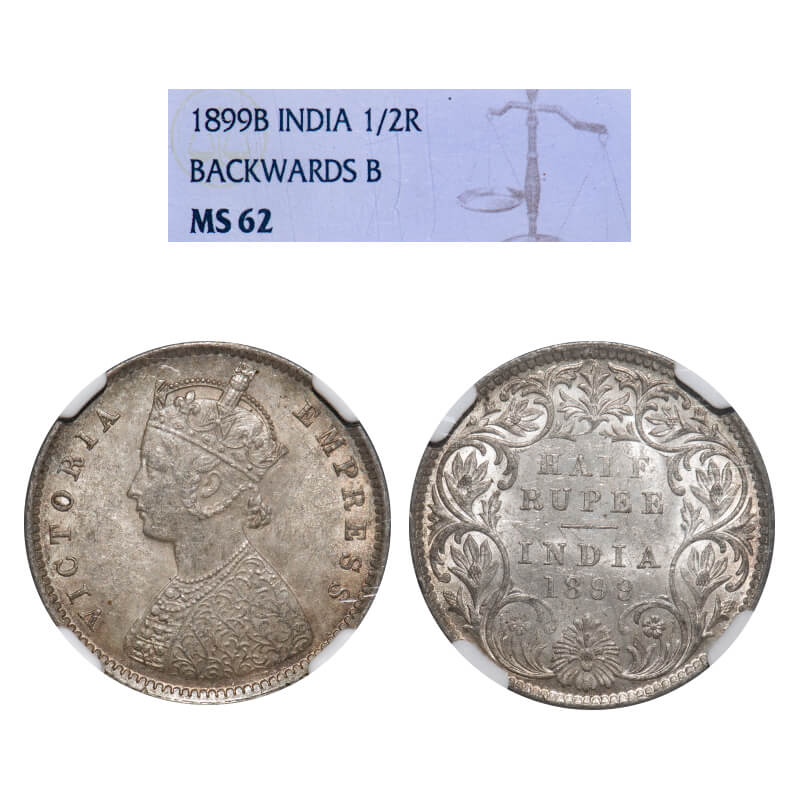 Victoria Empress, Silver, Half Rupee, 1899, Bombay Mint, A/I, 'B' incused, B incused inverted. F. Prid 307. GK 662. NGC Slab MS 62. Rare.