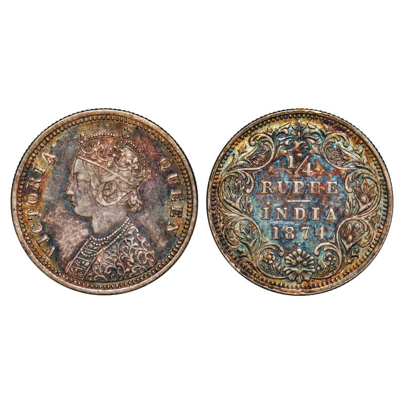 Victoria Queen, Silver, 1/4 Rupee, 1874, Calcutta Mint, A/I, No mint mark, No 'C'. F. Prid 379. GK ...