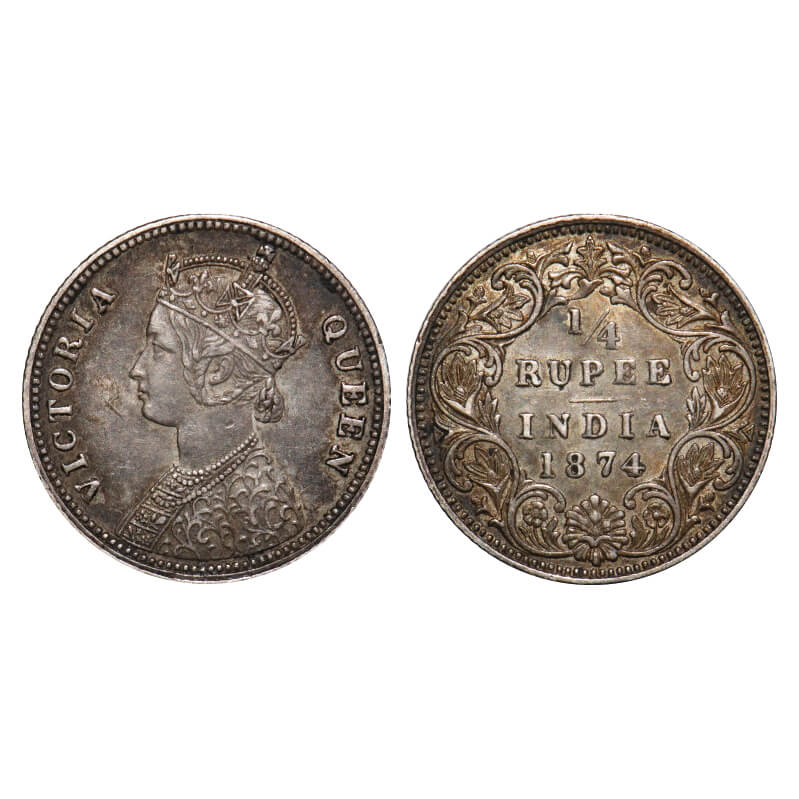 | Victoria Queen, Silver, 1/4 Rupee, 1874, Calcutta Mint, A/I, No mint mark, No 'C'. F. Prid 379. GK 665. Extremely Fine, Details. Very Scarce. |