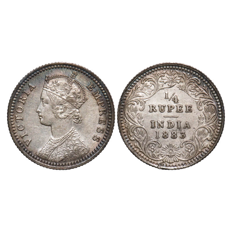 Victoria Empress, Silver, 1/4 Rupee, 1883, Calcutta Mint, C/II, 'C' incused. F. Prid 388. GK 692. Extremely Fine+. Rare.