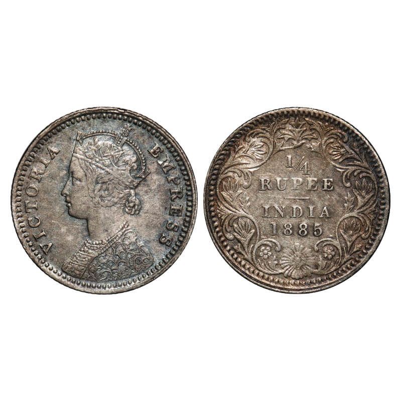 Victoria Empress, Silver, 1/4 Rupee, 1885, Calcutta Mint, C/II, 'C' incused. F. Prid 390. GK 702. About Extremely Fine. Scarce.