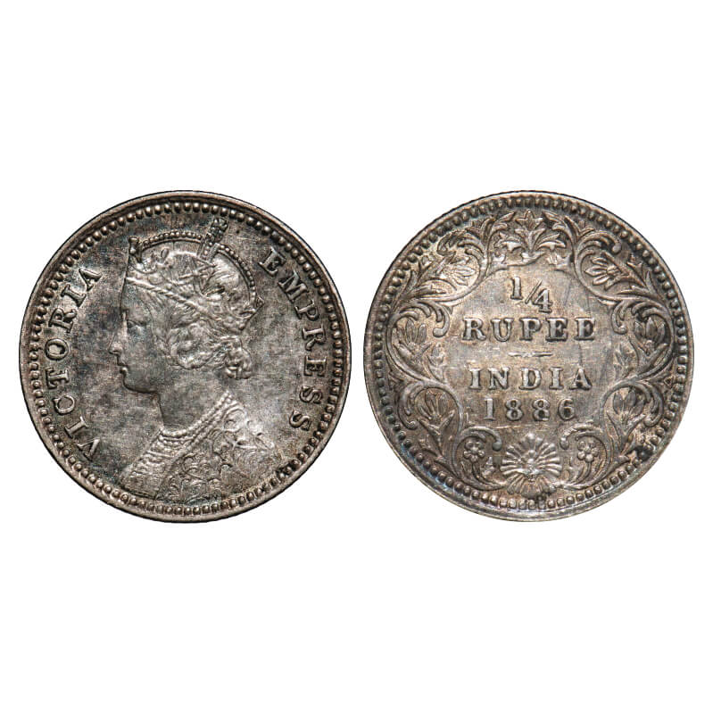 Victoria Empress, Silver, 1/4 Rupee, 1886, Calcutta Mint, C/II, 'C' incused. F. Prid 391. GK 707. Very Fine+. Scarce.