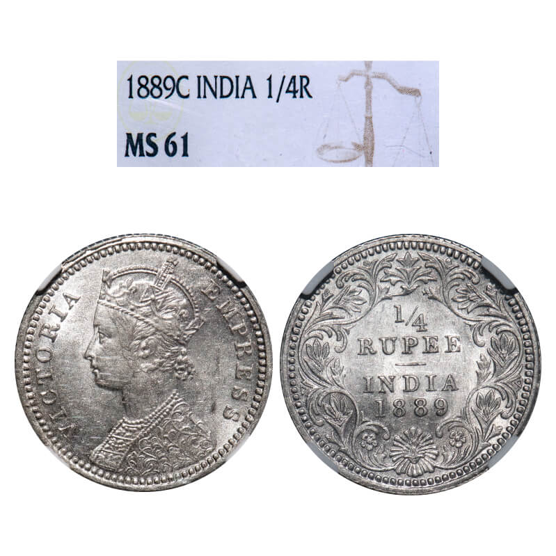 Victoria Empress, Silver, 1/4 Rupee, 1889, Calcutta Mint, C/II, 'C' incused. F. Prid 394. GK 716. NGC Slab MS 61. Rare.