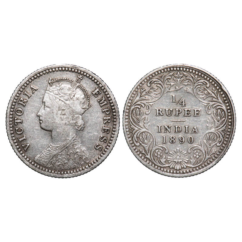 Victoria Empress, Silver, 1/4 Rupee, 1890, Calcutta Mint, C/II, 'C' incused. F. Prid 395. GK 719. Very Fine. Scarce.