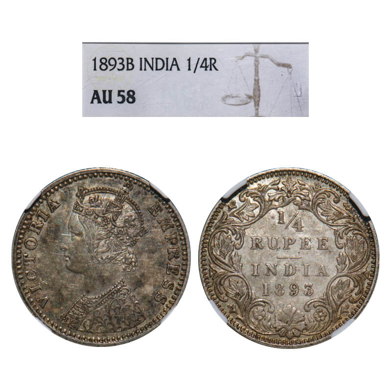 Victoria Empress, Silver, 1/4 Rupee, 1893, Bombay Mint, C(i)/I, 'B' incused. F. Prid 428. GK 724. NGC Slab AU 58. Very Scarce.