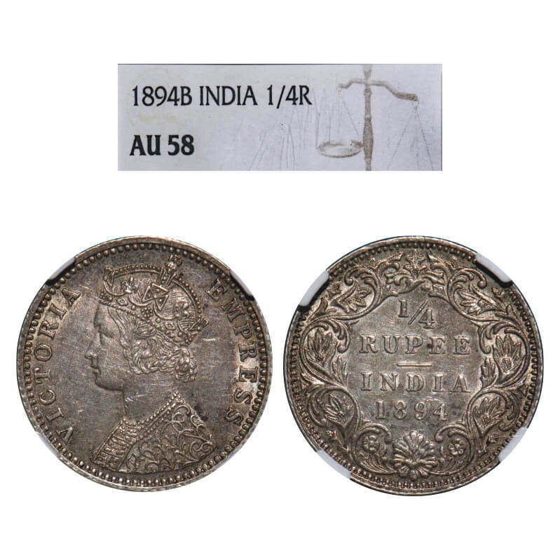 Victoria Empress, Silver, 1/4 Rupee, 1894, Bombay Mint, C(i)/I, 'B' incused. F. Prid. GK 726. NGC Slab AU 58. Very Scarce.