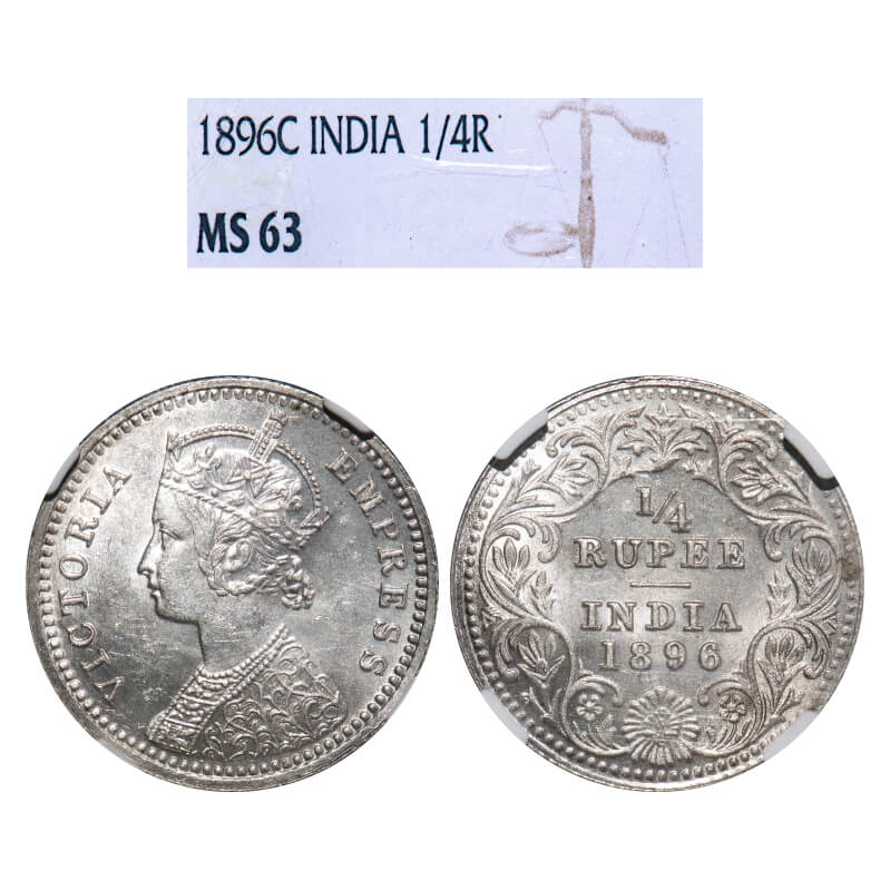 Victoria Empress, Silver, 1/4 Rupee, 1896, Calcutta Mint, C/II, 'C' incused. F. Prid 400. GK 728. NGC Slab MS 63. Very Rare.