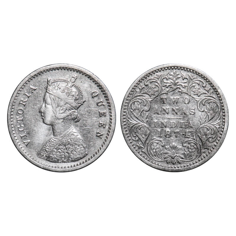 Victoria Queen, Silver, 2 annas, 1875, Bombay Mint, A/I, No mint mark, No dot. F. Prid 517. GK 741....
