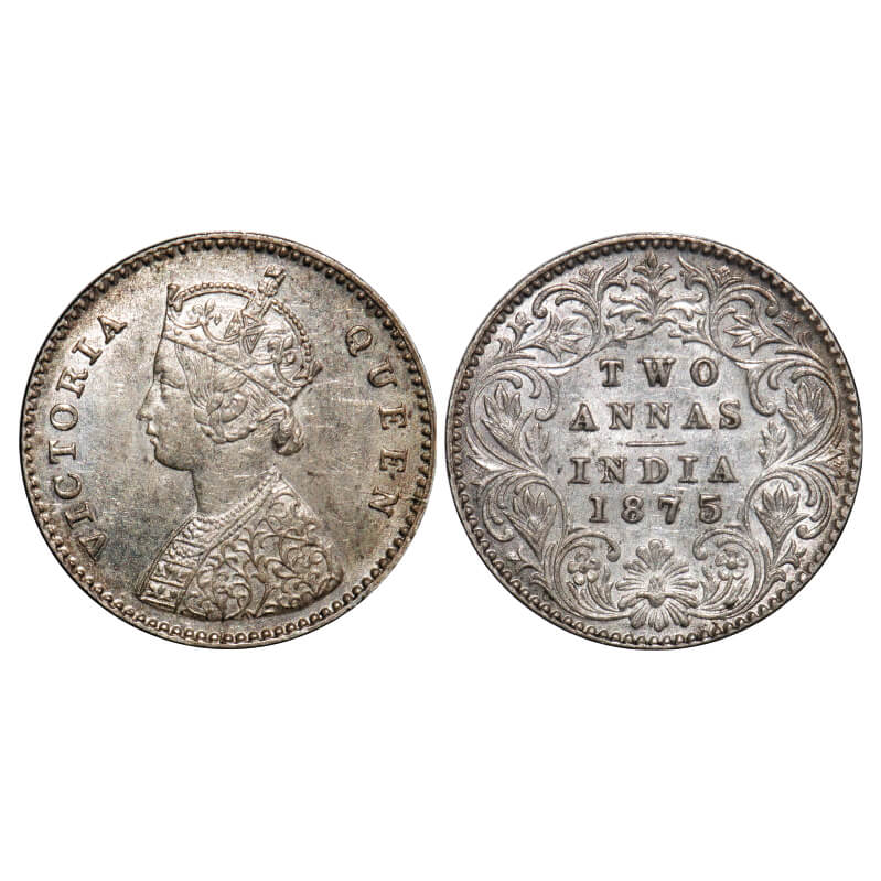 Victoria Queen, Silver, 2 Annas, 1875, Calcutta Mint, A/I, No mint mark, Die crack on Obv. F. Prid 489. GK 742. Almost Uncirculated. Rare.