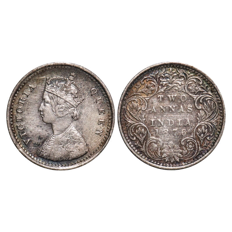 Victoria Queen, Silver, 2 Annas, 1876, Bombay Mint, A/I, No mint mark, No dot. F. Prid 518. GK 743. Very Fine. Very Scarce.
