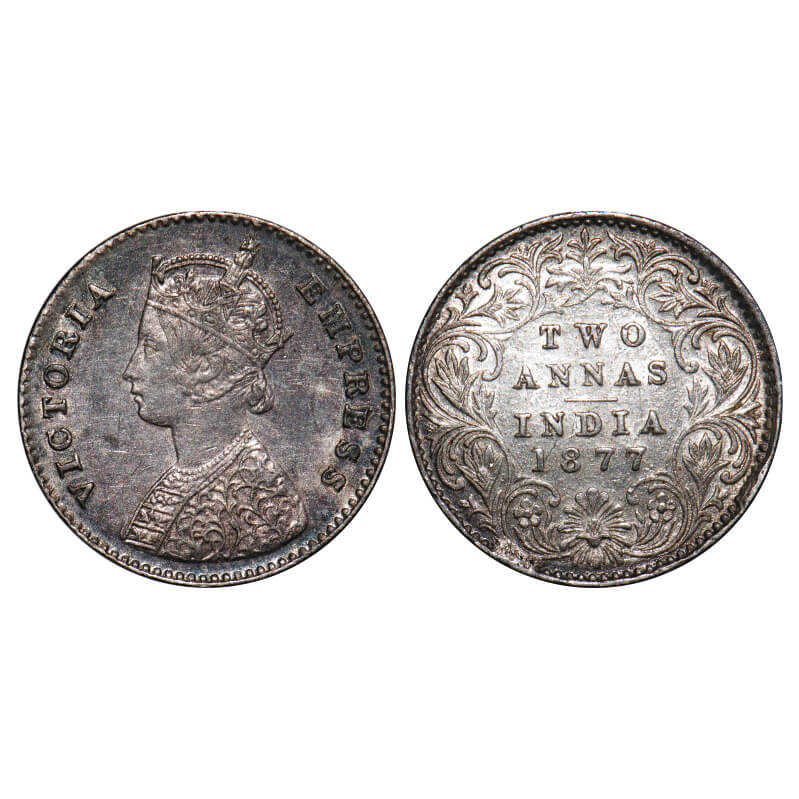 Victoria Empress, Silver, 2 Annas, 1877, Calcutta Mint, A/I, No mint mark. F. Prid 491. GK 748. About Uncirculated. Very Scarce.