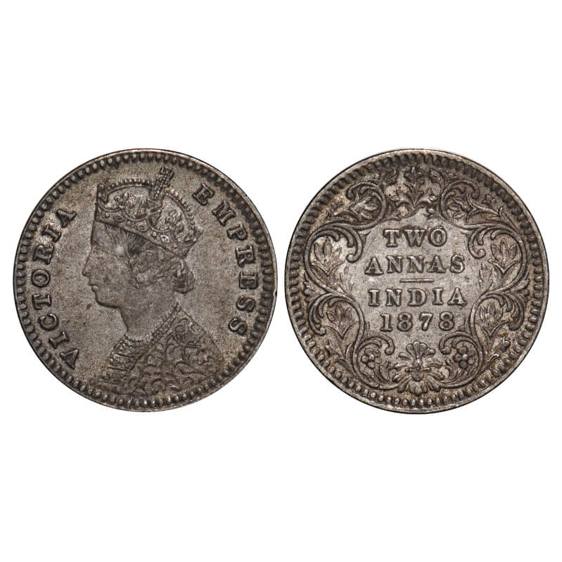 Victoria Empress, Silver, 2 Annas, 1878, Calcutta Mint, B/II, No mint mark. F. Prid 493. GK 751. Extremely Fine+, Details. Very Scarce.