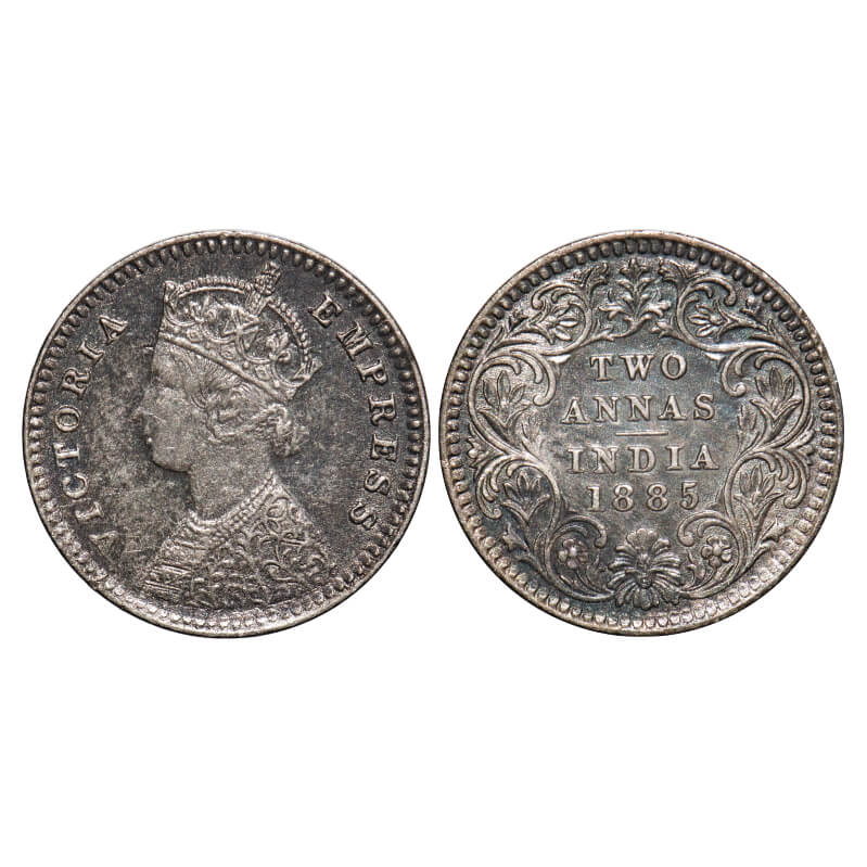 Victoria Empress, Silver, 2 Annas, 1885, Calcutta Mint, B/II, 'C' incused. F. Prid 500. GK 779. Extremely Fine. Very Scarce.