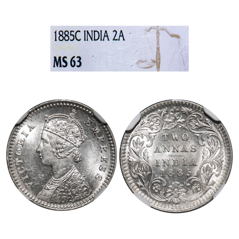 Victoria Empress, Silver, 2 Annas, 1885, Calcutta Mint, B/II, 'C' incused. F. Prid 500. GK 779. NGC Slab MS 63. Very Rare.