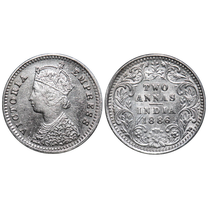 Victoria Empress, Silver, 2 annas, 1886, Bombay Mint, B/II, 'B' incused, Ghost on Rev. F. Prid 539. GK 781. About Uncirculated. Very Scarce.