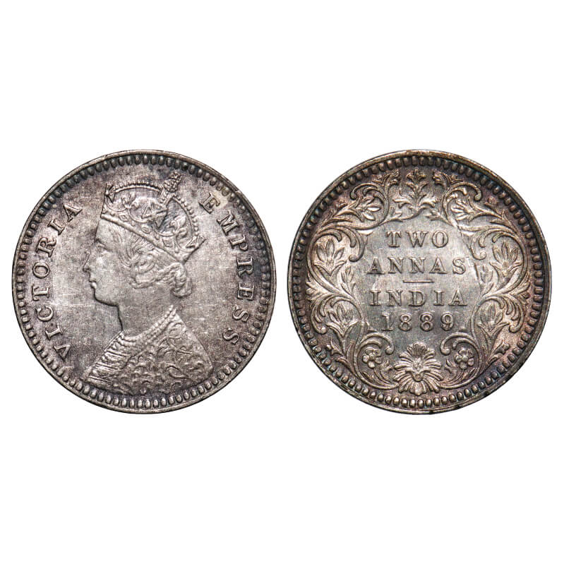 Victoria Empress, Silver, 2 Annas, 1889, Calcutta Mint, B/II, 'C' incused. F. Prid 504. GK 788. About Uncirculated. Very Scarce.