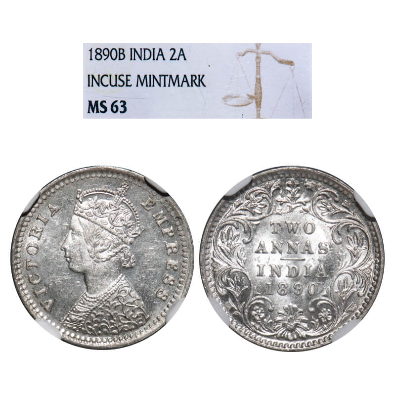 Victoria Empress, Silver, 2 Annas, 1890, Bombay Mint, B/II, 'B' incuse. F. Prid 545. GK 792. NGC Slab MS 63. Very Rare.
