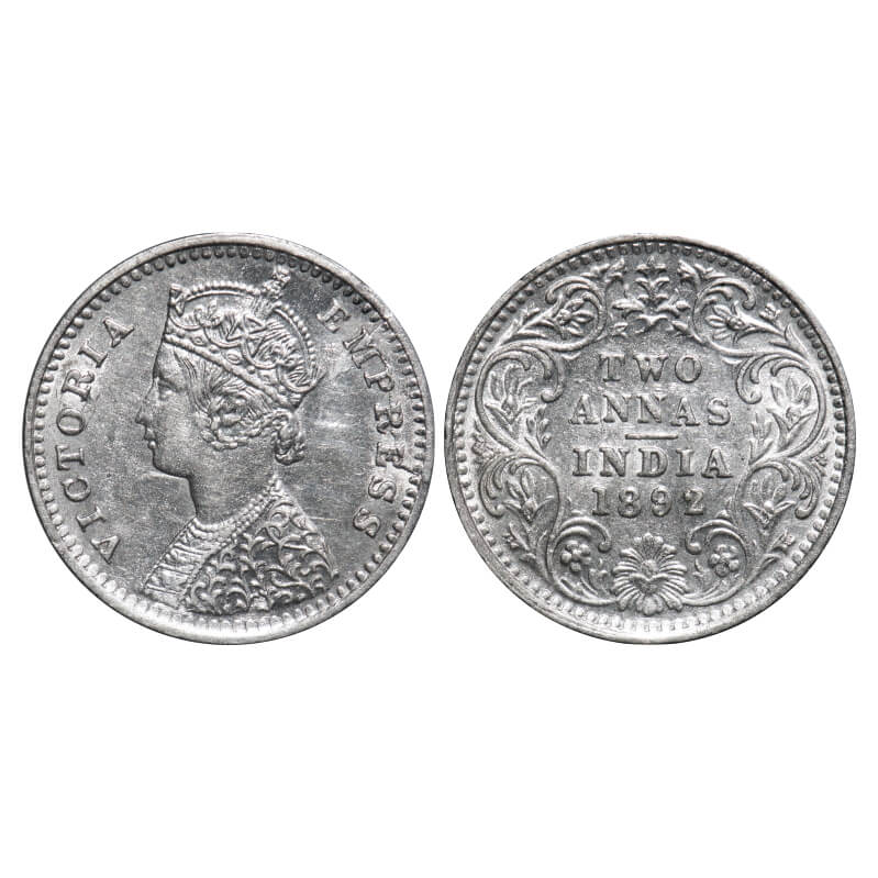 Victoria Empress, Silver, 2 Annas, 1892, Bombay Mint, B/II, 'B' incused. F. Prid 547. GK 796. Almost Uncirculated. Very Scarce.