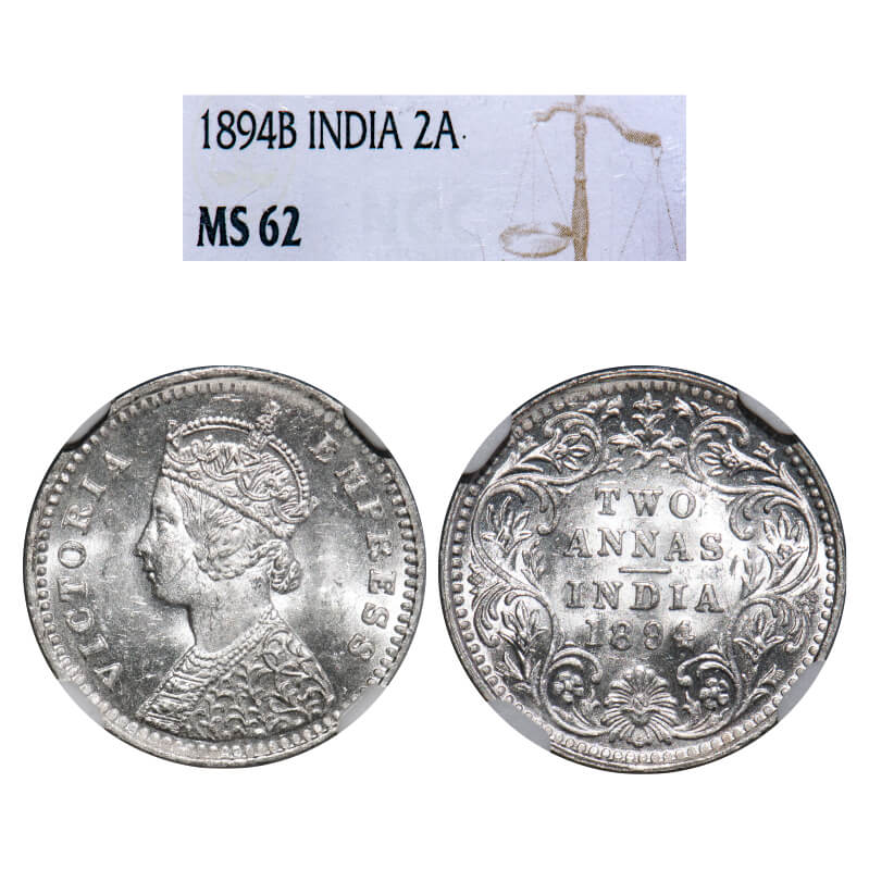 Victoria Empress, Silver, 2 Annas, 1894, Bombay Mint, B/II, 'B' incused. F. Prid 549. GK 801. NGC Slab MS 62. Rare.