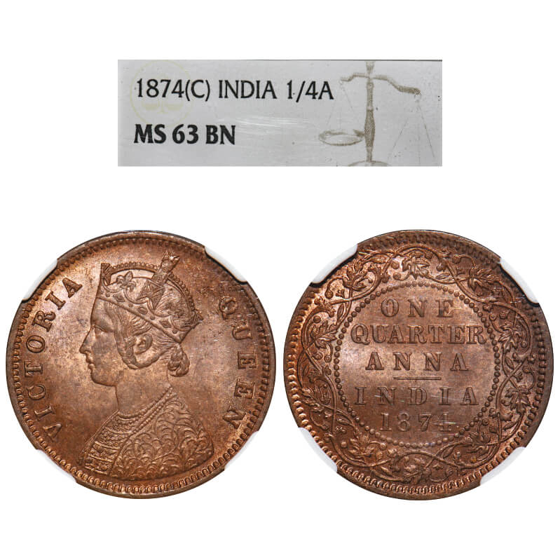 Victoria Queen, Copper, Quarter Anna, 1874, Calcutta Mint, B/II, No mint mark. F. Prid 608. GK 823. NGC Slab MS 63 BN. Rare.
