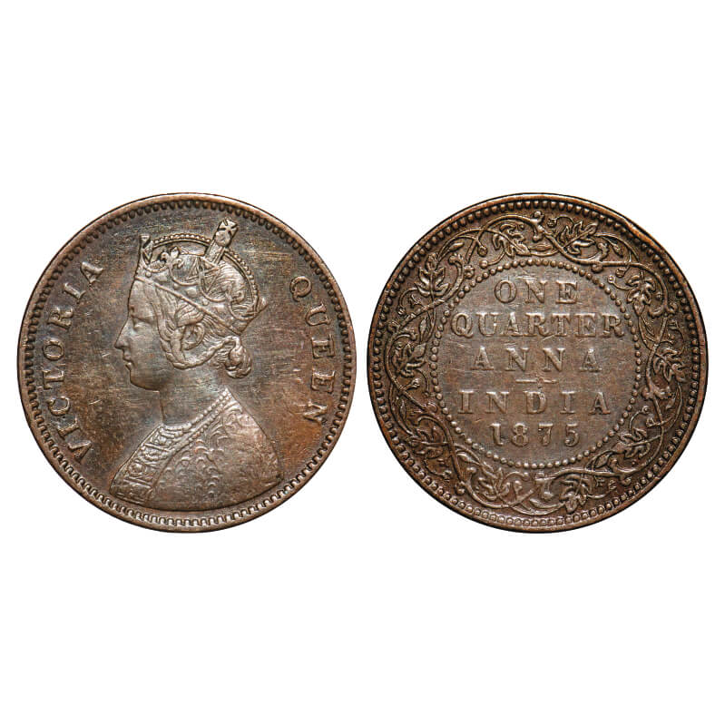 Victoria Queen, Copper, Quarter Anna, 1875, Bombay Mint, A/I, No mint mark. F. Prid 635. GK 824. About Extremely Fine. Very Scarce.
