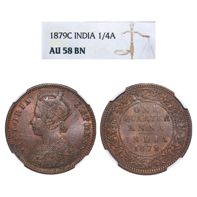 Victoria Empress, Copper, Quarter Anna, 1879, Calcutta Mint, B/II, 'C' incused. F. Prid 613. GK 831. NGC Slab AU 58 BN. Very Rare.