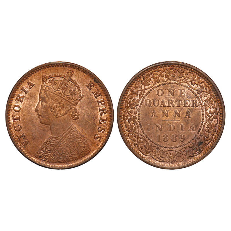 Victoria Empress, Copper, Quarter Anna, 1889, Calcutta Mint, B/II, No mint mark. F. Prid 622. GK 848. Uncirculated. Scarce.