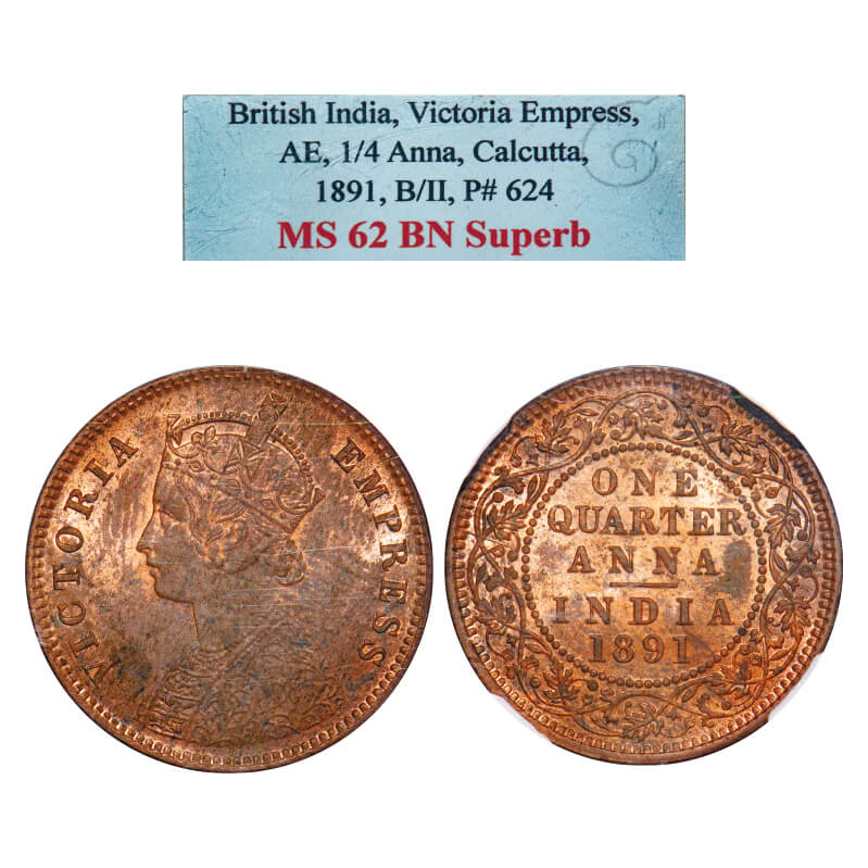 Victoria Empress, Copper, Quarter Anna, 1891, Calcutta Mint, B/II, No mint mark. F. Prid 624. GK 850. NGS Slab MS 62 BN Superb. Rare.