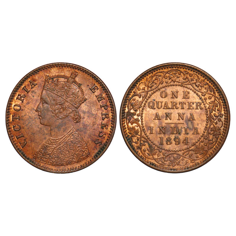 Victoria Empress, Copper, Quarter Anna, 1894, Calcutta Mint, B/II, No mint mark. F. Prid 627. GK 853. Uncirculated. Scarce.