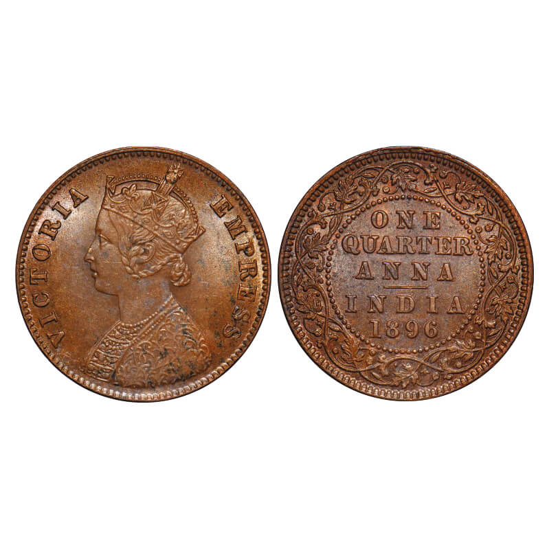 Victoria Empress, Copper, Quarter Anna, 1896, Calcutta Mint, B/II, No mint mark. F. Prid 629. GK 855. Uncirculated. Very Scarce.