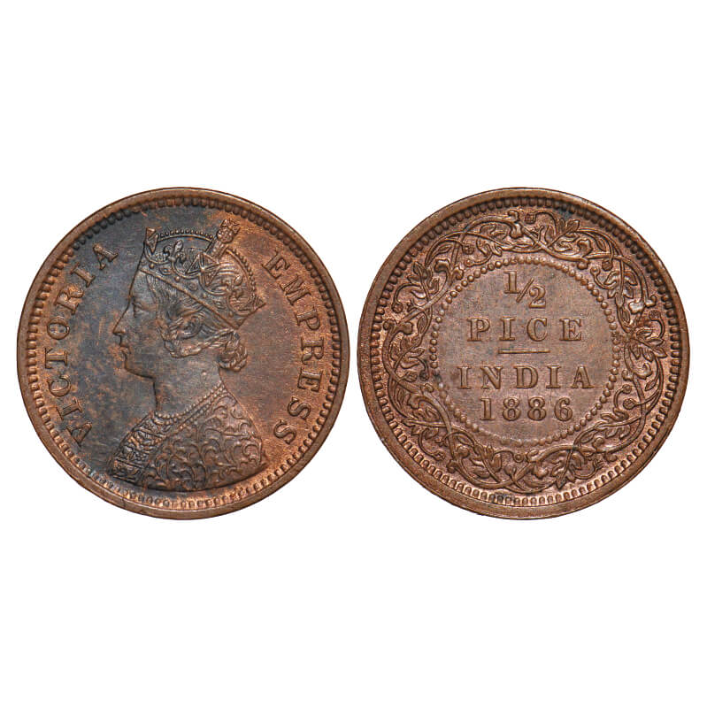 Victoria Empress, Copper, 1/2 Pice, 1886, Calcutta Mint, A/I, No mint mark. F. Prid 718. GK 865. Extremely Fine+. Very Scarce.