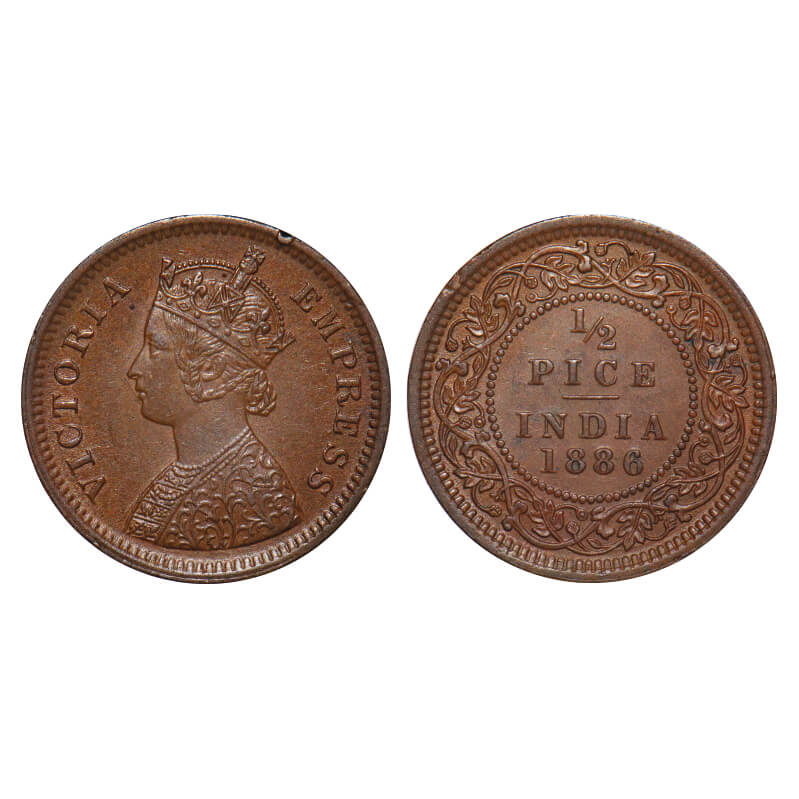 Victoria Empress, Copper, 1/2 Pice, 1886, Calcutta Mint, A/I, No mint mark, A small nick on Obv rim edge. F. Prid 718. GK 865. Amost Uncirculated. Very Scarce.