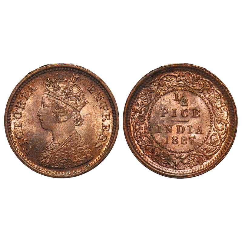 Victoria Empress, Copper, 1/2 Pice, 1887, Calcutta Mint, A/I, No mint mark, Die cracks on Obv. F. Prid 719. GK 867. Almost Uncirculated. Very Scarce.