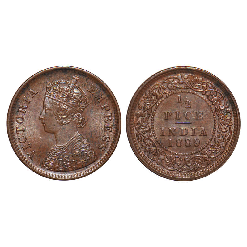 Victoria Empress, Copper, 1/2 Pice, 1889, Calcutta Mint, A/I, No mint mark. F. Prid 721. GK 869. Brilliant Uncirculated. Very Rare.