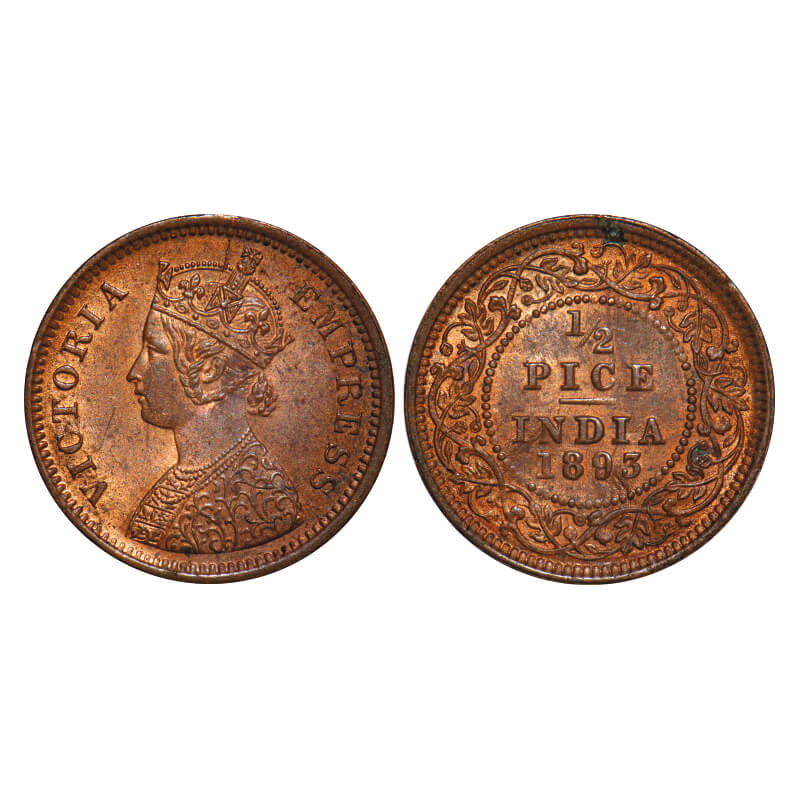 Victoria Empress, Copper, 1/2 Pice, 1893, Calcutta Mint, A/I, No mint mark, Ghost on Rev. F. Prid 726. GK 873. Uncirculated. Very Scarce.