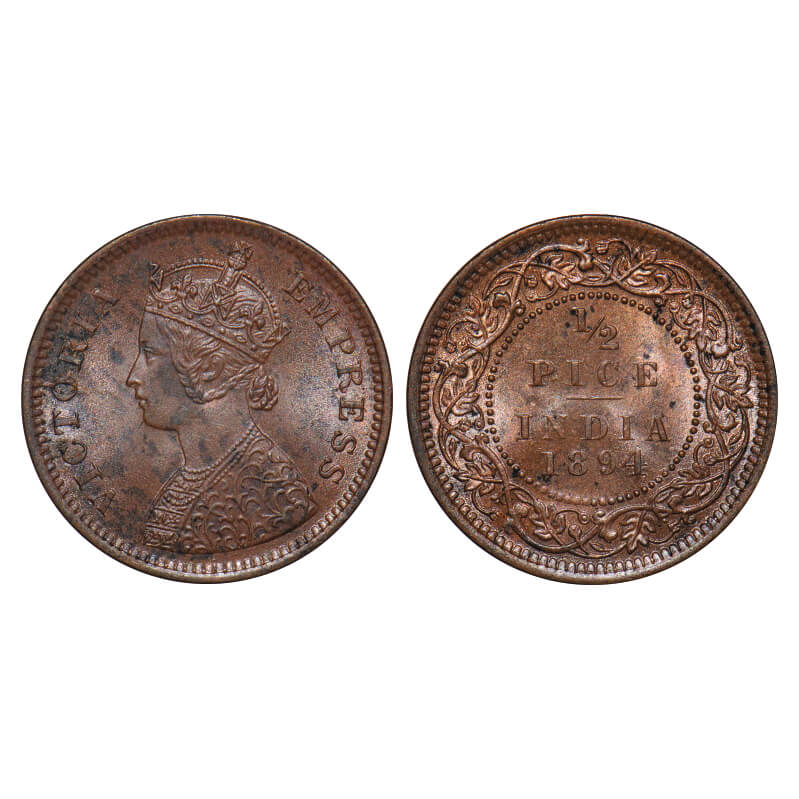 Victoria Empress, Copper, 1/2 Pice, 1894, Calcutta Mint, A/I, No mint mark. F. Prid 727. GK 874. Uncirculated, Details. Very Scarce.