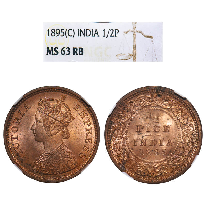 Victoria Empress, Copper, 1/2 Pice, 1895, Calcutta Mint, A/I, No mint mark. F. Prid 728. GK 875. NGC Slab MS 63 RB. Rare.